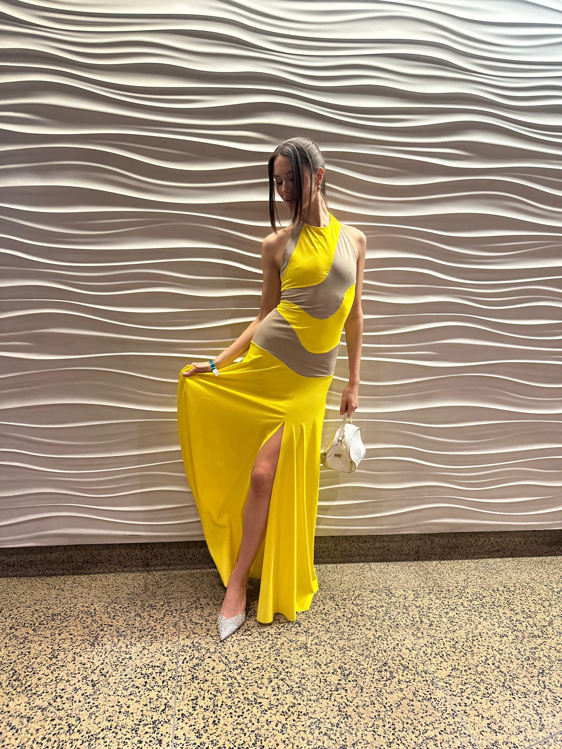 It's sleek silhouette hugs and releases with purpose: bold yellow panels curve across a soft, neutral base, creating a visual rhythm that elongates the body. The top is double-lined for strength and smoothness, offering structure without restriction. The skirt flows freely, opening with movement, echoing the energy of wind and water.